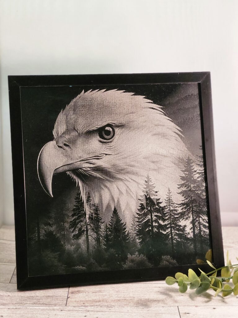 Show your patriotic pride with this stunning 8×8 black frame laser-engraved American Eagle wall art. Expertly crafted with precision engraving, this powerful design captures the strength and beauty of the bald eagle, making it the perfect addition to your home, office, or cabin décor. The sleek black frame adds a modern touch, while the detailed laser engraving highlights the artistry and craftsmanship in every piece.
