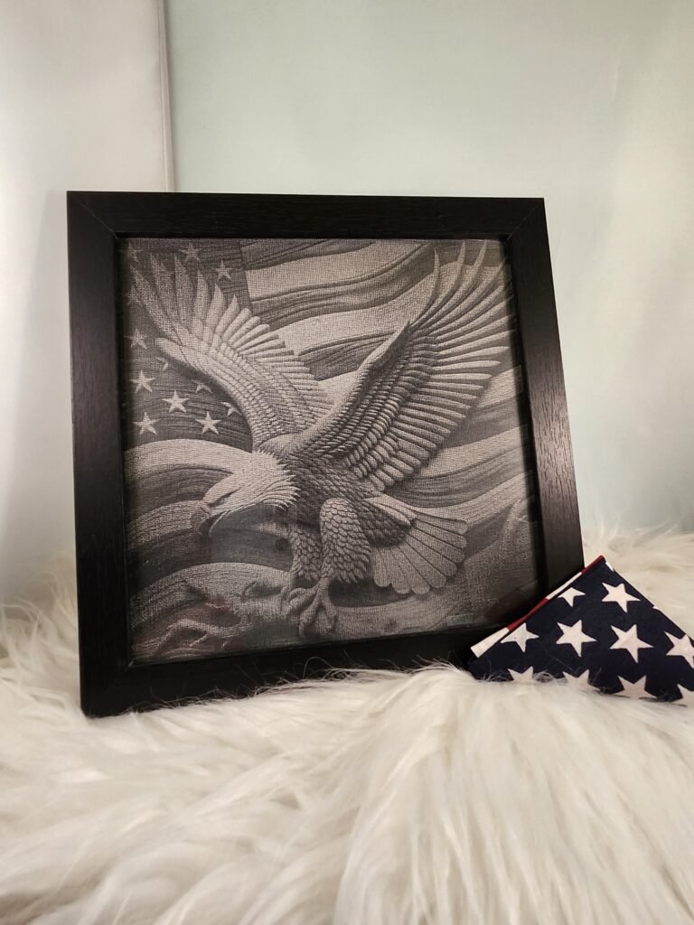 Show your American pride with this striking engraved American eagle picture featuring a bold background of the U.S. flag in timeless black and white. Precision laser engraving brings out every feather, star, and stripe in crisp detail, creating a powerful piece of patriotic wall art.