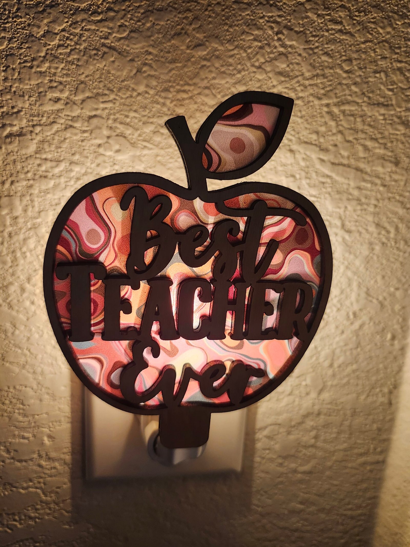 Show appreciation for your favorite educator with this Best Teacher nightlight, laser cut and/or engraved with charming detail. Measuring 4″ to 4½”, this handcrafted nightlight provides a warm, comforting glow, making it perfect for desks, bedrooms, classrooms, or hallways.
