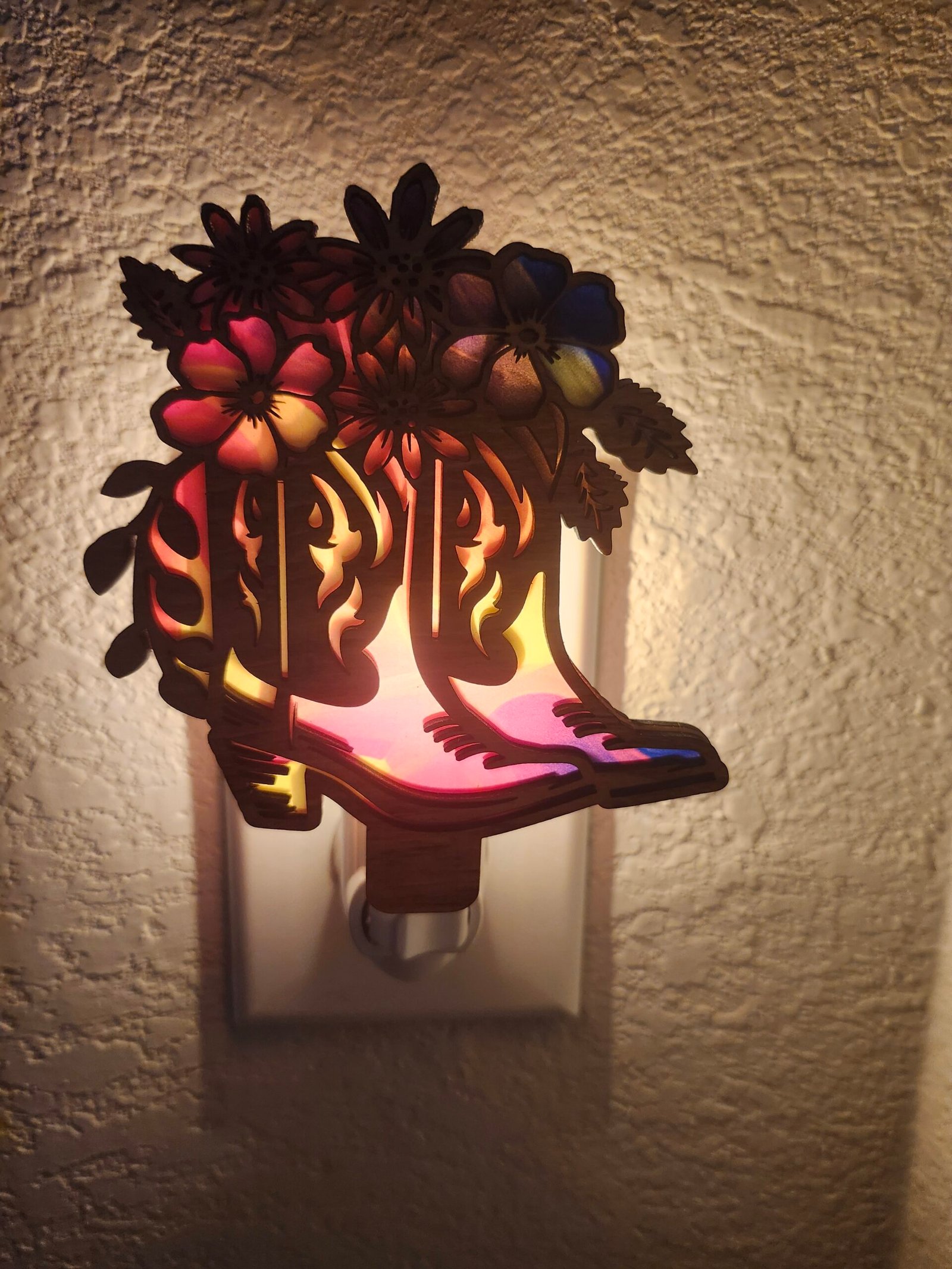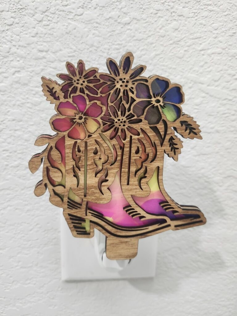 Bring a touch of rustic charm to your home with this Boots with Flowers nightlight, laser cut with intricate floral details. Measuring 4″ to 4½”, this handcrafted nightlight features a charming boot design filled with flowers, perfect for country-style décor, farmhouse accents, or cozy living spaces.