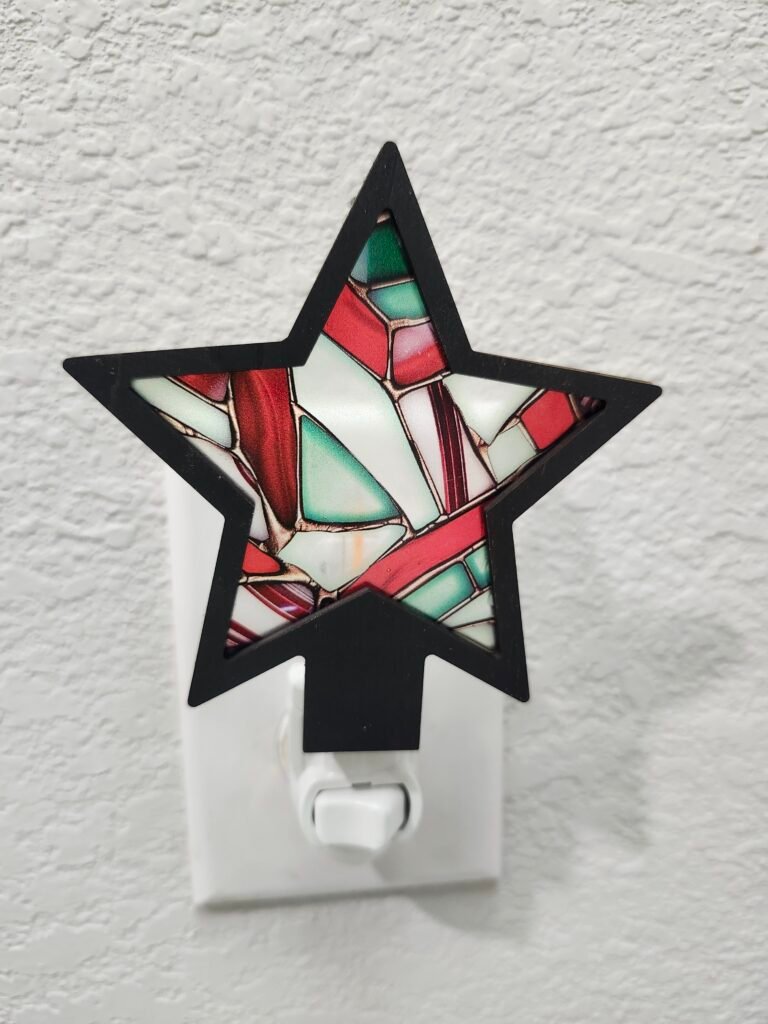 Add a heavenly glow to your holiday décor with this Christmas Star Nightlight, beautifully laser cut with stain glass look festive detail. Measuring 4″ to 4½”, this elegant nightlight casts a warm, inviting light that’s perfect for living rooms, hallways, bedrooms, bathrooms, or Christmas displays.
