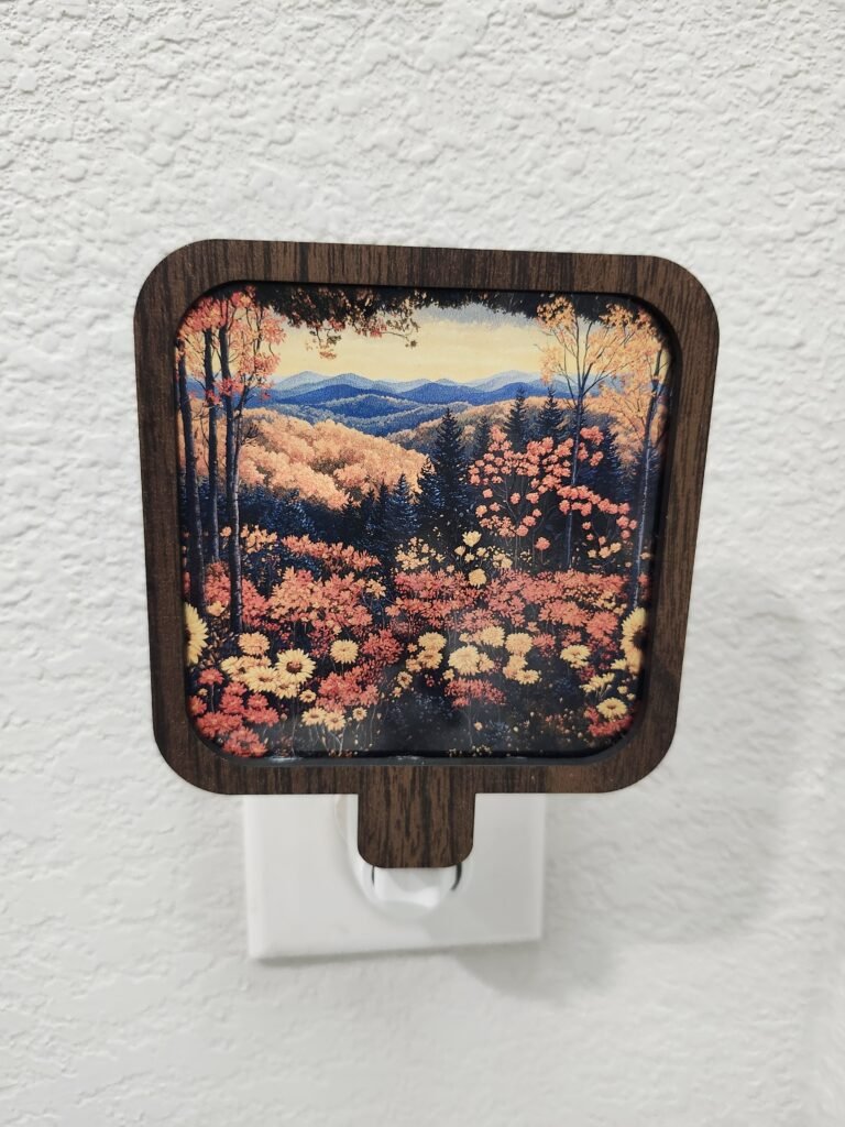 Create a warm, inviting glow in your home with this Fall Scene nightlight, beautifully laser cut and/or engraved with intricate seasonal details. Measuring 4″ to 4½”, this handcrafted nightlight adds the perfect touch of autumn charm to any room.