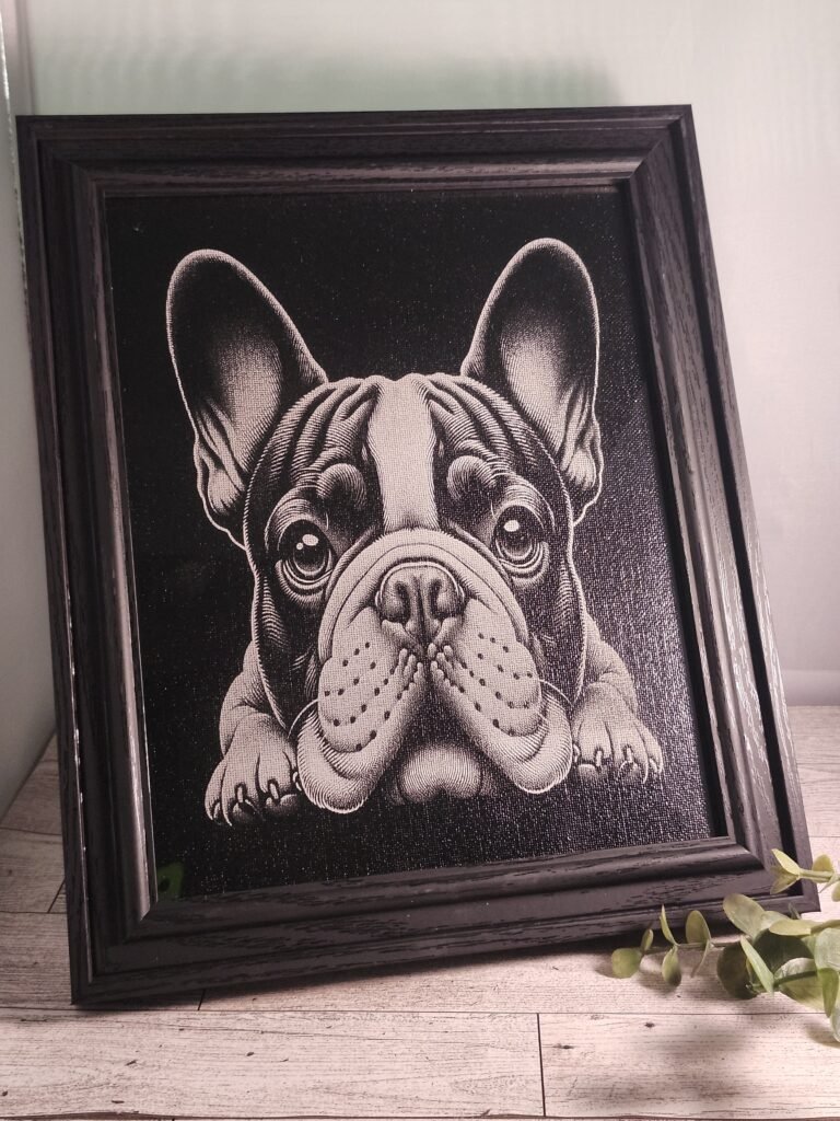 Showcase your love for one of the most adorable and popular breeds with this 8×10 black-and-white engraved picture of a French Bulldog. Precision laser engraving brings out every detail of this playful pup, creating a stunning piece of dog lover wall art that’s both elegant and timeless.