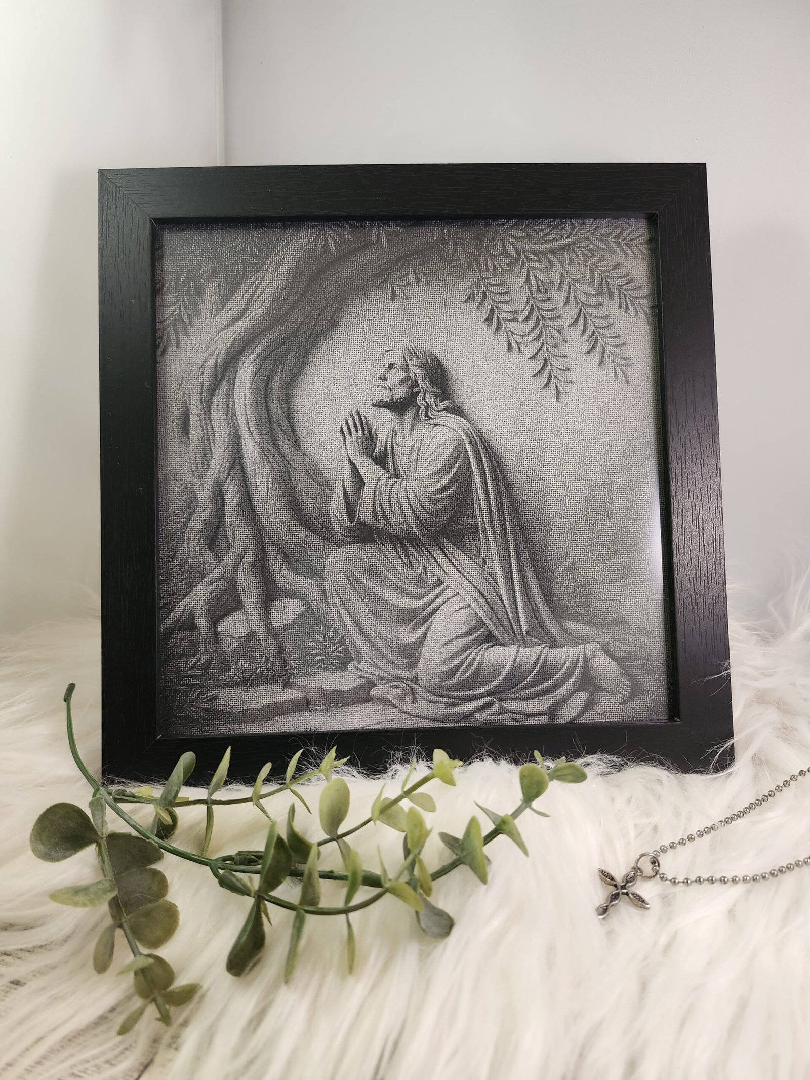Crafted with care, the image of Jesus Christ is permanently etched into high-quality material, capturing depth, emotion, and reverence in every line. The elegant black frame enhances the artwork, making it ready to display on any wall or tabletop.