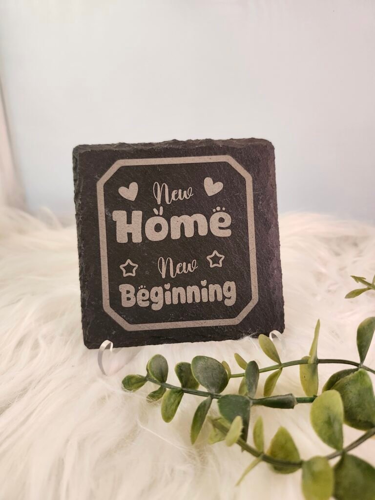Mark the joy of a new chapter with this engraved New Home New Beginning slate coaster – a functional and memorable way to celebrate a special milestone.