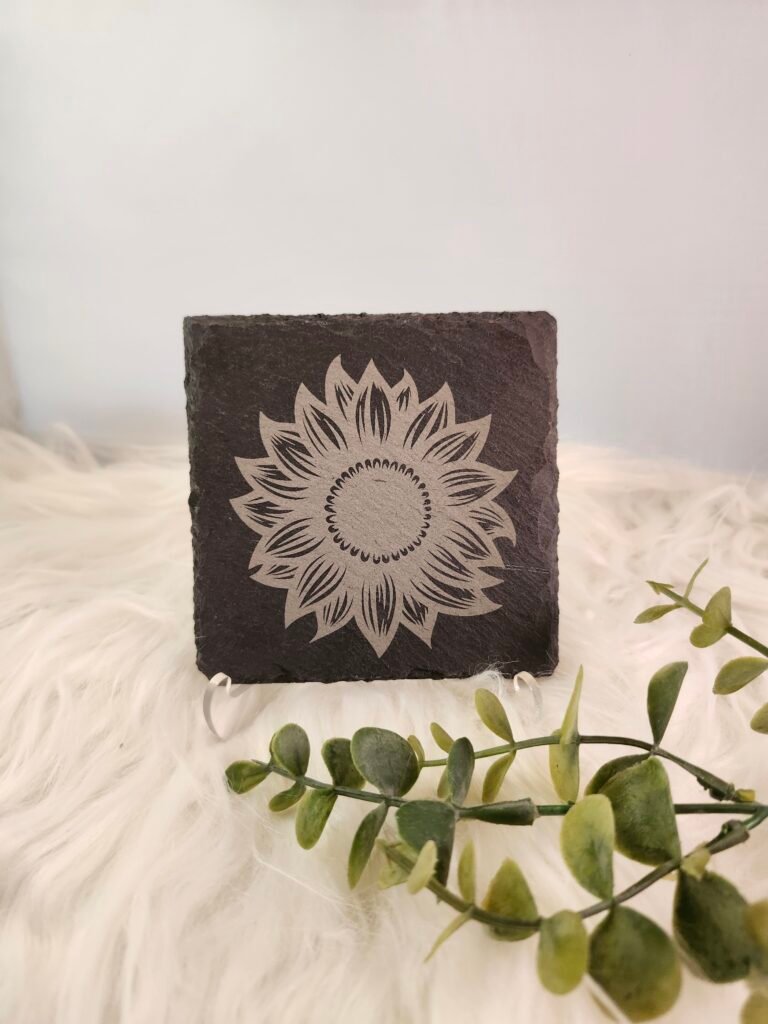 Bring the beauty of nature indoors with this engraved sunflower slate coaster – a functional piece of rustic art.