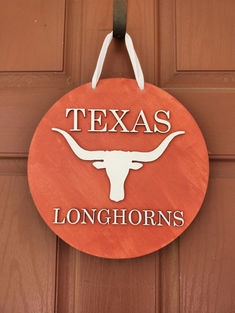 Show your Texas pride with this UT Longhorn Door Hanger, a must-have for every fan of the University of Texas! This 12-inch laser cut Longhorn wall and door hanger is crafted with precision and painted with durable outdoor paint to withstand weather conditions, making it perfect for year-round display. Whether you hang it on your front door, porch, office, or use it as Longhorn wall art in your home or game room, this piece is ready to hang and built to last. A great gift idea for UT alumni, students, and sports fans, this Longhorn hanger is the perfect way to show off your burnt orange spirit.